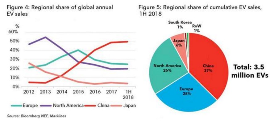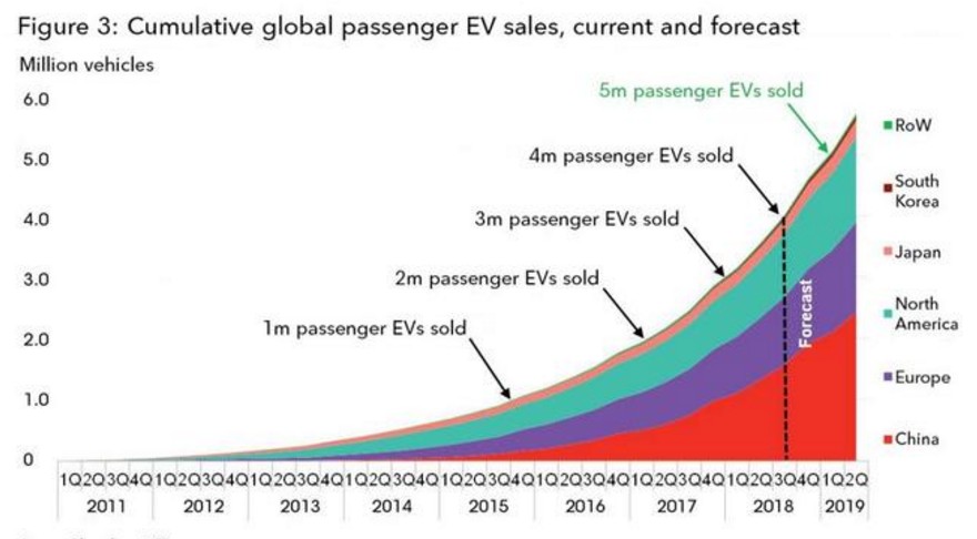 預(yù)計(jì)全球電動(dòng)車?yán)塾?jì)銷量突破500萬僅需6個(gè)月時(shí)間,即到2019年3月份。未來電動(dòng)車銷量的增長約42%的份額將會(huì)來自中國市場(chǎng),而歐洲和北美則將分別貢獻(xiàn)26%和25%。(林淼)