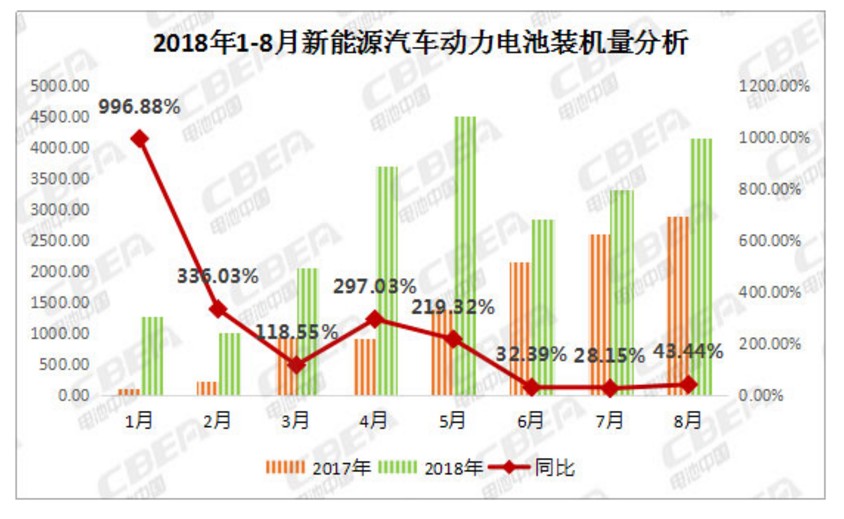 據(jù)動力電池應(yīng)用分會研究部分析數(shù)據(jù)顯示,2018年8月,我國新能源汽車動力電池裝機量約4.17Gwh,環(huán)比增長25%,同比增長43.44%;1-8月累計裝機總量約22.97Gwh。
