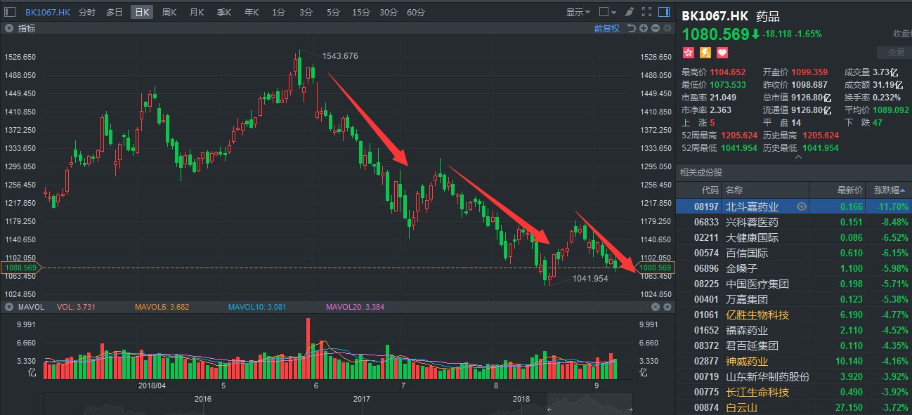 據(jù)智通財(cái)經(jīng)APP觀察,截至9月10日,上證跌了1.21個(gè)點(diǎn);恒指跌幅超過1.33%,50只成分股,僅包括九龍倉(cāng)置業(yè)(01997)在內(nèi)的6只股票小范圍飄紅,而醫(yī)藥板塊方面,繼續(xù)下挫,普遍以“掛綠”收盤,大勢(shì)可謂慘不忍睹。