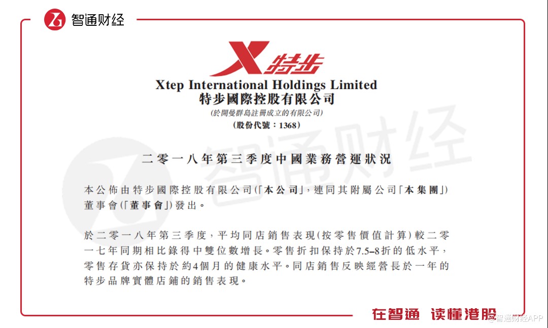 智通財經APP獲悉,10月8日公告稱,公司于2018年第三季度,平均同店銷售表現(xiàn)(按零售價值計算)較2017年同期相比實現(xiàn)中雙位數(shù)增長。零售折扣保持于7.5–8折的低水平,零售存貨也保持于約4個月的健康水平。