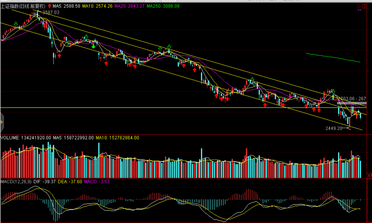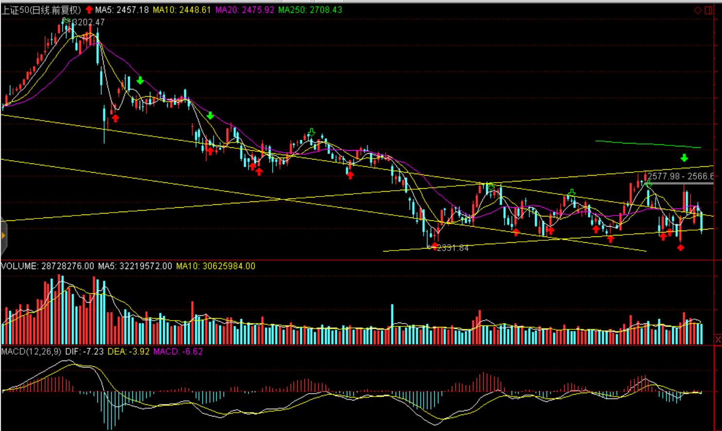 周一兩市股指全天震蕩下跌,股指均報(bào)收中陰線。上證50跌3.21%報(bào)2389.58點(diǎn),滬綜指收跌2.18%報(bào)2542.1點(diǎn),深證成指跌2.43%報(bào)7322.24點(diǎn),創(chuàng)業(yè)板指跌1.01%報(bào)1250.48點(diǎn)。兩市僅成交2554億元,環(huán)比減少271億元,北上資金今日逆勢(shì)凈流入逾29億元。盤面看白酒領(lǐng)跌大消費(fèi)白馬,茅臺(tái)跌停引發(fā)蝴蝶效應(yīng),食品、家電、醫(yī)藥聯(lián)袂大幅下跌,資金集中流出消費(fèi)白馬。