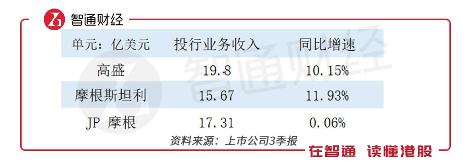 對(duì)于投行業(yè)務(wù),三家華爾街老牌券商規(guī)模相近,其中高盛最高,而JP摩根的同比增速最慢。