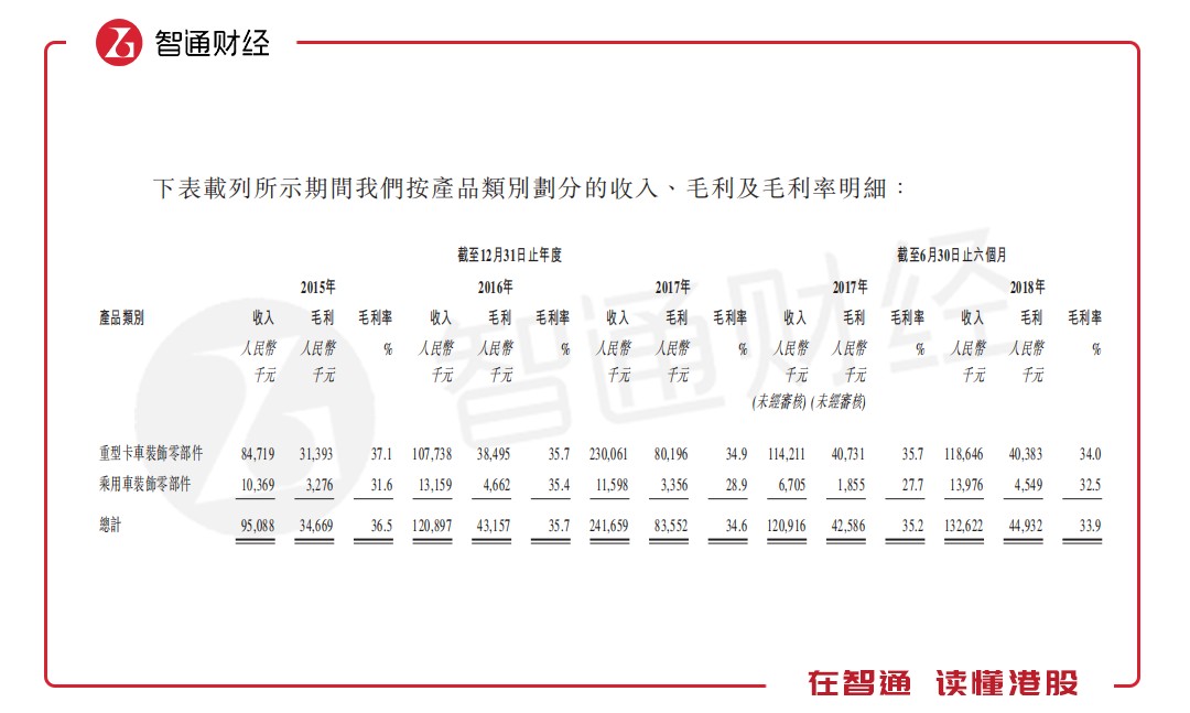 此外,天瑞在招股書中指出,就公司近期財務(wù)表現(xiàn)而言,公司的收入從截至2017年10月31日止10月的約1.97億元減至截至2018年10月31日止10個月的約1.92億元,略微減少為2.6%。然而,公司截至2018年10月31日止4個月的毛利率為35.8%,略高于上年同期的34.0%。鑒于收入減少并不明顯,以及與2018年上半年相比,公司截至2018年10月31日止4個月實現(xiàn)穩(wěn)定的毛利率及月平均毛利,因此并無跡象顯示公司的重型卡車裝飾零部件業(yè)務(wù)分部會顯著下跌。
