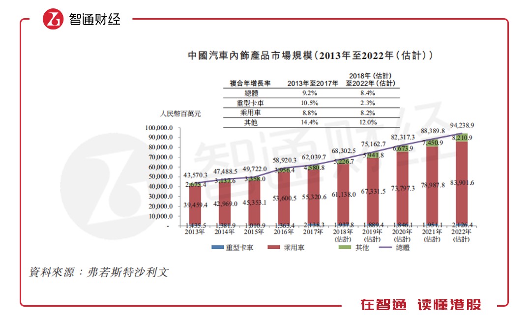 智通財經(jīng)APP進一步查閱天瑞招股說明書發(fā)現(xiàn),從行業(yè)來看中國汽車內(nèi)飾產(chǎn)品市場的總值由2013年的435.7億元增至2017年的620.4億元,復(fù)合年增長率為9.2%。估計市場規(guī)模將于2022年達到942.39億元,2018年至2022年期間的復(fù)合年增長率為8.4%。