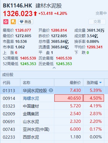 水泥板塊升4.2%華潤(rùn)水泥控股(01313)領(lǐng)漲