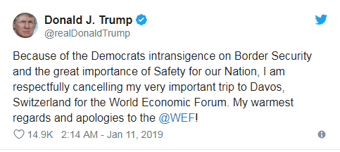 特朗普表示,由于民主黨在邊境安全問題上的頑固態(tài)度和國家安全的重要性,他謹(jǐn)慎地取消前往瑞士達沃斯參加世界經(jīng)濟論壇的行程,并向世界經(jīng)濟論壇致以問候和歉意。另外,美國政府高級官員表示,即使本月晚些時候政府仍處于關(guān)閉狀態(tài),美國財政部長姆努欽將帶領(lǐng)美國政府代表團出席達沃斯論壇。