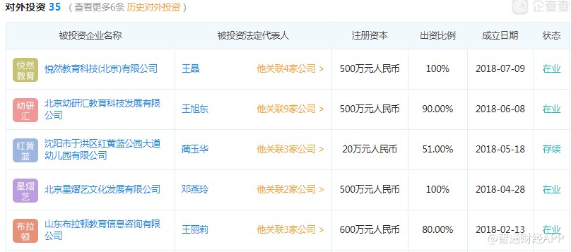 不過,在內(nèi)地業(yè)務(wù)上,該公司今后的發(fā)展方向或也會(huì)出現(xiàn)一些變化,教育衍生品或?qū)⑹窃摴就顿Y方向,以該公司2018年投資的標(biāo)的來說,根據(jù)企查查的數(shù)據(jù),該公司投資成立的大部分是教育相關(guān)的服務(wù)。以下為企查查搜到的紅黃藍(lán)2018年投資成立的項(xiàng)目: