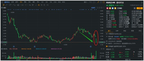 近日,大龍頭紙企晨鳴紙業(yè)(01812)發(fā)布2019年一季度業(yè)績預告,同比94.25%-96.17%的下滑,直接讓已經近30多個交易日不斷下跌的股價,再度迎來大跌。截止4月15日早盤,晨鳴紙業(yè)大跌9.47%,僅半日交易量、成交額達到1075萬股、4728萬港元,是前一整日交易量的近9.5倍。