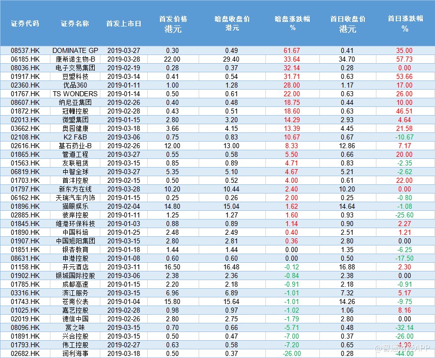 另外,截至一季度底,36只新股中,共有14只股失守發(fā)行價,破發(fā)率為39%。值得的注意的是,相比于2018年港股新股70%的破發(fā)率,2019年一季度的破發(fā)率有明顯的下降。其中,天瑞汽車內(nèi)飾以42.36%,成為一季度市場表現(xiàn)最差新股。而嘉藝控股則以196.23%的漲幅,成為一季度市場表現(xiàn)最牛新股。(陳嘉林)