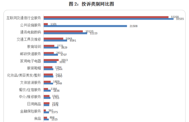 互聯(lián)網(wǎng)及通信行業(yè)服務(wù)投訴33535宗,投訴量繼續(xù)位居第一位,但增長幅度有所縮小,同比僅增長4.14%。