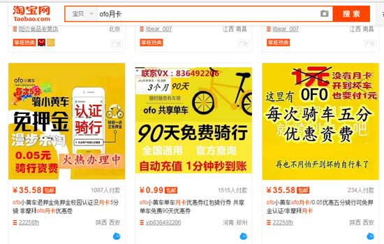 人民網(wǎng)IT頻道記者在調(diào)查中發(fā)現(xiàn),在摩拜和ofo的月卡漲價(jià)5-10倍的同時(shí),兩家公司大量的高折扣優(yōu)惠卡卻轉(zhuǎn)移到淘寶等電商平臺(tái)公開(kāi)出售,在淘寶上輸入“摩拜月卡”、“ofo月卡”則出現(xiàn)了大批免押金、8.8元包月、9.99元包月、0.05元騎行資費(fèi)的廣告,這些高折扣的優(yōu)惠卡從何而來(lái),卻是一個(gè)謎。