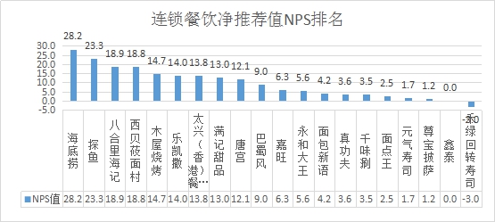 數(shù)據(jù)表明,此次調(diào)研餐飲品品牌整體的平均凈推薦值為9.4分。排名第一的是海底撈,凈推薦值為28.2分;其次是探魚,凈推薦值為23.3分;第三名是八合里海記,凈推薦值為18.9分。前十名品牌依次為,海底撈、探魚、八合里海記、西貝莜面村、木屋燒烤、樂凱撒、太興(香港)餐廳、滿記甜品、唐宮、巴蜀風(fēng)。禾綠回轉(zhuǎn)壽司在此次調(diào)研中凈推薦值僅為-3.0分,在凈推薦值排名中墊底。