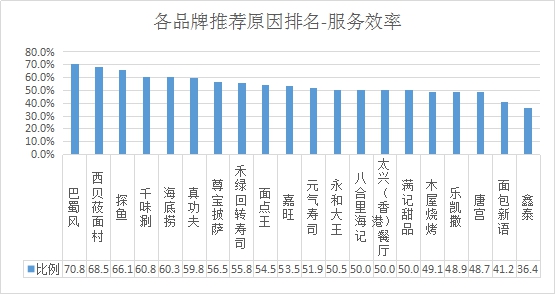 服務(wù)效率推薦率排名:排名前三的是巴蜀風(fēng)、西貝莜面村、探魚;