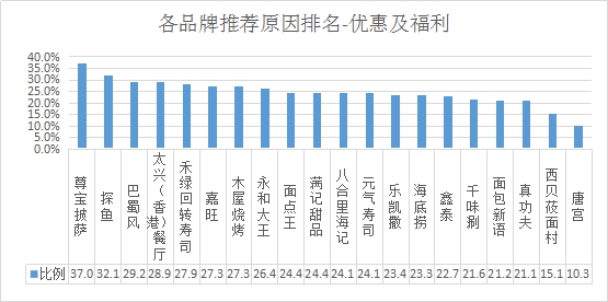 排名第一的是尊寶披薩,優(yōu)惠及福利推薦率為37.0%;其次是探魚,推薦率為32.1%;第三名是巴蜀風(fēng),推薦率為29.2%。
