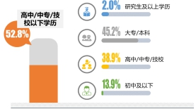 本次調(diào)研中,連鎖餐飲消費(fèi)者中,23歲-30歲是主要消費(fèi)者,占比36.1%,30歲以下的消費(fèi)者占比為65.7%。52.8%的受訪者學(xué)歷為高中/中專/技校及以下 。