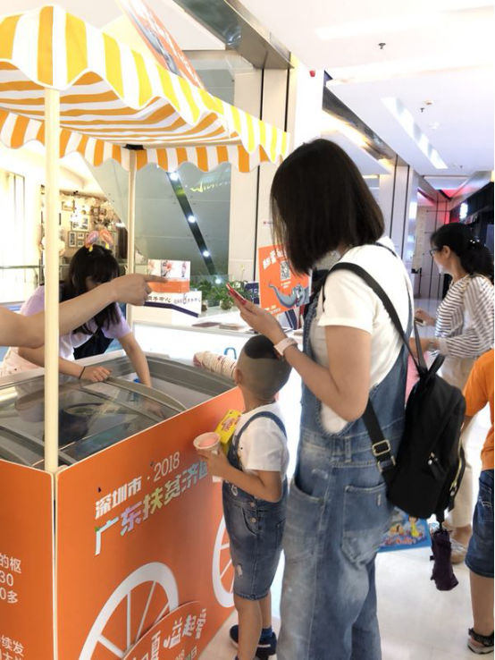 6月23日,“甜蜜初夏 慈善一直在”深圳10大地標(biāo)冰激凌義賣活動在在福田星河COCO Park啟動。現(xiàn)場,很多逛商場的市民掃碼購買冰淇淋,為扶貧濟(jì)困活動捐款。特別讓志愿者感觸的是,不少家長帶著小朋友路過,看到是給貧困人們貢獻(xiàn)愛心,紛紛參與進(jìn)來要買冰激凌。