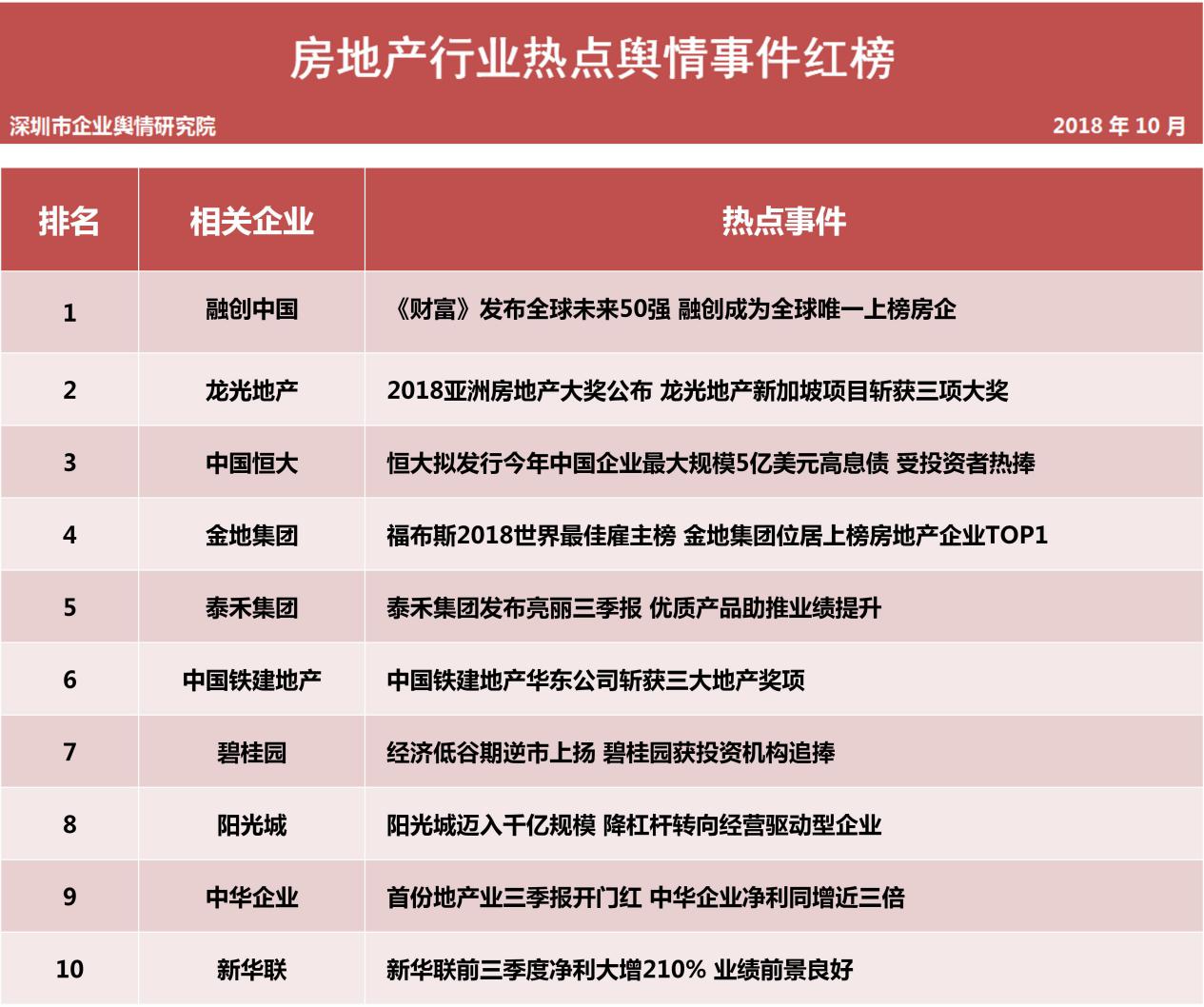 榜單顯示,紅榜中,融創(chuàng)中國在上期獲得紅榜“最紅”企業(yè)后,本期再次榮登紅榜榜首,本期中融創(chuàng)中國能再次登頂與其獲得“《財富》未來全球50強”有著重要的關系,同時融創(chuàng)中國也成為2018 《財富》未來全球50強企業(yè)中唯一上榜的房產企業(yè);黑榜中,地產行業(yè)巨頭“萬科”,因一條關于萬科給降價前購買廈門白鷺郡的業(yè)主每戶“退款100萬”的消息,身陷羅生門。此消息一出瞬間引爆了地產圈,同時也讓其成為本期中最受關注的“負面”熱點事件。