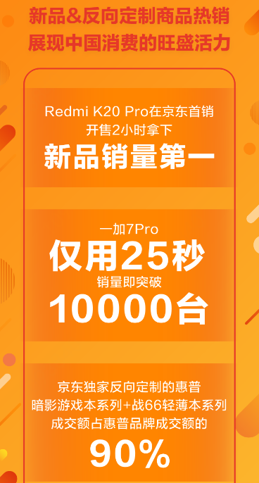 Redmi K20 Pro特地選擇在京東618期間首銷,其中還針對(duì)京東的用戶推出了京東獨(dú)家版本,而Redmi K20 Pro的整體銷售成績也表現(xiàn)不俗,在開售2小時(shí)就拿下新品銷量第一;而在京東618期間推出的一加7Pro,僅用了25秒就銷售上萬部。