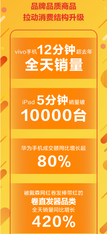 作為傳統(tǒng)優(yōu)勢(shì)品類,手機(jī)在今年618年中購物節(jié)首日的表現(xiàn)仍舊搶眼。vivo手機(jī)12分鐘超去年全天銷量,最終全天的銷量達(dá)到去年同期的11倍;華為手機(jī)成交額同比增長超80%,華為手機(jī)配件成交額同比增長超300%; iPad在5分鐘的銷量就突破萬臺(tái)。