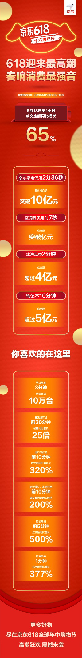 深圳新聞網(wǎng)2019年6月18日訊 6月18日零點(diǎn)的鐘聲猶如一聲清脆的發(fā)令槍?zhuān)〇|618十六周年慶迎來(lái)了18天中的下單最高潮,中國(guó)億萬(wàn)消費(fèi)市場(chǎng)的旺盛活力在這一刻盡情綻放,第一個(gè)小時(shí)的成交金額同比增長(zhǎng)65%,京東在618這場(chǎng)席卷全民消費(fèi)熱潮中的核心地位進(jìn)一步凸顯。