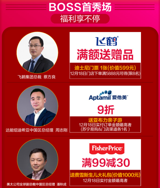 12月18日,蘇寧紅孩子打造了線上線下雙線齊發(fā)的“年終狂歡搶購盛典”。母嬰品牌大佬帶頭發(fā)福利,飛鶴集團總裁蔡方良、達能紐迪希亞中國區(qū)總經(jīng)理周志剛、美太公司全球副總裁中國區(qū)總經(jīng)理潘秋成、寶潔大中華區(qū)幫寶適副總裁任遠,金佰利大中華區(qū)董事總經(jīng)理Mike等豪送價值十萬大禮?;顒赢斕欤徬鄳放飘a(chǎn)品且實付金額最高者就能將戴森吹風機、老鳳祥黃金、迪士尼門票等大禮免費帶回家。