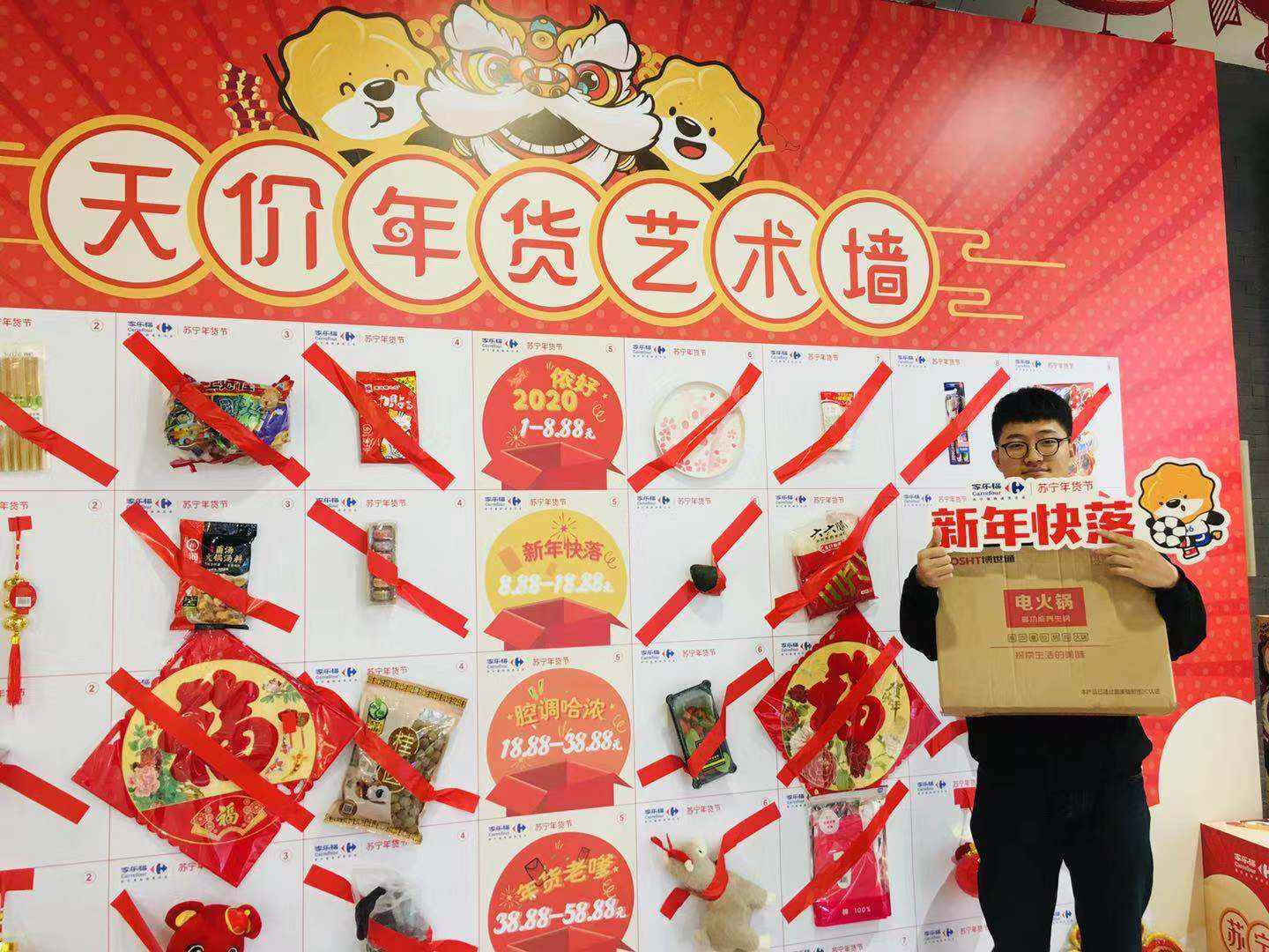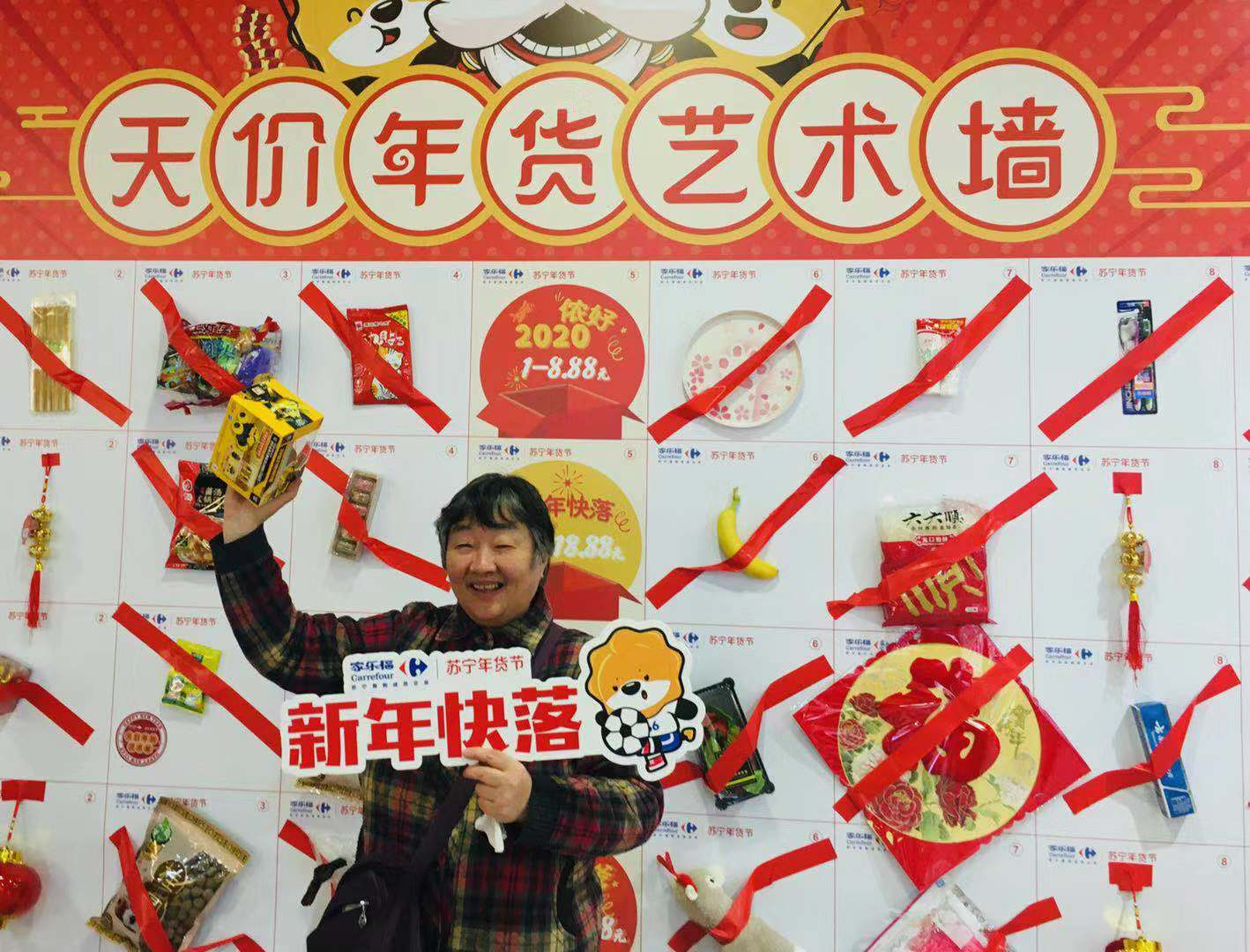 1月10日上午,記者來到家樂?!澳晡豆狻碧靸r(jià)年貨藝術(shù)墻的活動(dòng)現(xiàn)場(chǎng),眾多市民正想躍躍欲試。記者發(fā)現(xiàn),在天價(jià)年貨藝術(shù)墻上,有儂好2020、新年快落、腔調(diào)哈濃、年貨老嗲、“鼠”儂最美五類天價(jià)年貨。
