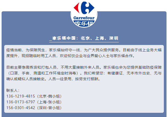 此外,家樂(lè)福還向全社會(huì)發(fā)出召集,以北京、上海、深圳為重點(diǎn)城市,希望社會(huì)暫時(shí)性歇業(yè)人員能夠前來(lái)上崗,主要工作職責(zé)為線上業(yè)務(wù)的揀貨、打包,不用大量接觸外來(lái)人員。家樂(lè)福將提供快速上崗培訓(xùn),包括個(gè)人安全衛(wèi)生和防護(hù)、顧客服務(wù)和崗位技能培訓(xùn),以及基礎(chǔ)防疫保障。