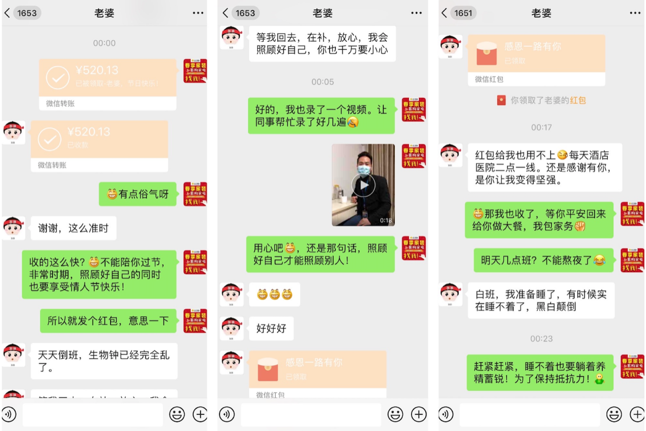 妻子也回贈(zèng)了紅包,說(shuō):“感謝有你,是你讓我變得堅(jiān)強(qiáng)?!?span style="text-indent: 2em;">盡管疫情讓他們相隔千里,但愛(ài)情始終連接著彼此的心。