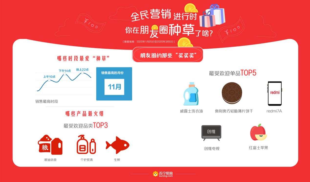 深圳新聞網(wǎng)2020年3月10日訊 線上買菜、線上看病、直播上課、遠(yuǎn)程健身……“宅經(jīng)濟(jì)”爆發(fā),使得社群私域流量積累的能量進(jìn)一步凸顯,全民營銷成為新風(fēng)口。近日,蘇寧易購發(fā)布全民營銷大數(shù)據(jù),2020年1月25日至3月5日,蘇寧推客買家數(shù)和賣家數(shù)分別突破千萬、百萬大關(guān),80后成為朋友圈買、賣“雙主力”,糧油休食、個護(hù)家清、生鮮等產(chǎn)品成為最受歡迎的消費品類。