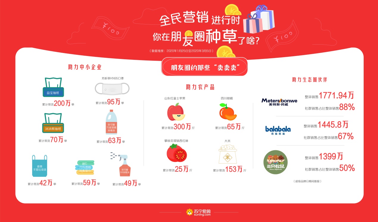 為有效解決農(nóng)產(chǎn)品銷售問題,也同步解決居民的“菜籃子”“果盤子”“米袋子”,蘇寧利用社群營銷幫助農(nóng)民賣出超千萬斤農(nóng)產(chǎn)品。據(jù)蘇寧大數(shù)據(jù)顯示,蘇寧推客累計帶貨山東紅富士蘋果300萬斤、四川柑橘65萬斤、攀枝花滯銷西紅柿25萬斤、大米153萬斤等,成功搭建了農(nóng)產(chǎn)品流通的橋梁,促進(jìn)了農(nóng)產(chǎn)品上行,為戰(zhàn)“疫”勝利奠定了堅實基礎(chǔ)。
