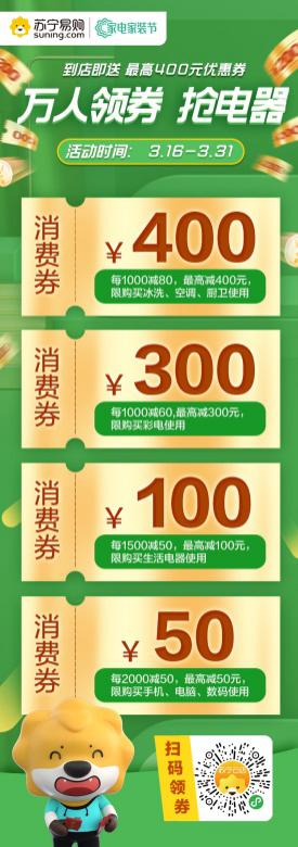據(jù)了解,深圳蘇寧3月16日至3月31日期間放出大招,強(qiáng)勢推出“萬人領(lǐng)券搶電器”活動(dòng),攜手空調(diào)、廚衛(wèi)、冰洗、彩電、3C數(shù)碼和生活電器全品類百大品牌全面發(fā)力,以千萬補(bǔ)貼讓利回饋消費(fèi)者。針對整個(gè)粵東區(qū)域限量投放近20萬張400元、300元、100元、50元不等的家電消費(fèi)券,在活動(dòng)前期通過社群、門店、金牌V購等線上線下即可領(lǐng)取,在粵東區(qū)域所有蘇寧門店及V購均可使用。