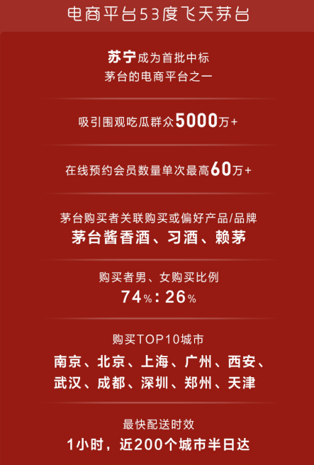 此外,蘇寧物流的半日達、次日達服務(wù),蘇寧小店的3公里最快半小時達服務(wù),也讓蘇寧酒水的配送服務(wù)優(yōu)勢明顯。