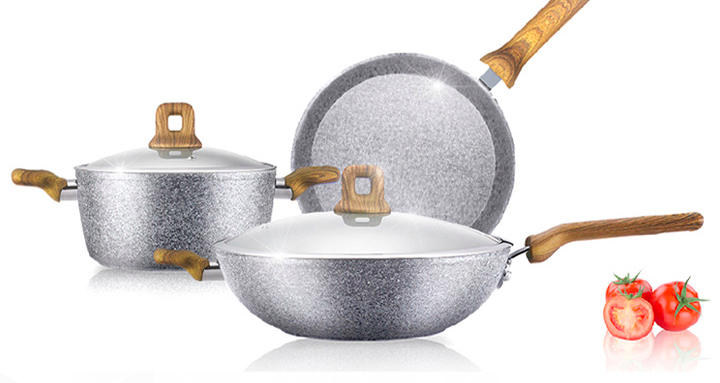 滿足炒、煎、燉多種需求,一套高品質(zhì)、高顏值的鍋具相信你一定不會(huì)拒絕。三禾鍋具三件套 T606是膳石犀利花崗巖健康不粘鍋,采用花崗巖納米起點(diǎn),不粘更持久,耐磨性更高,堪稱品質(zhì)首選。除此之外,其還擁有五層技術(shù)工藝,并采用一體成型設(shè)計(jì),質(zhì)量顏值雙升級(jí)。原木紋手柄,防霉防燙;鋼化玻璃蓋,密封防溢;節(jié)能復(fù)合底受熱均勻。三件套內(nèi)包含炒鍋、煎鍋、燉鍋。