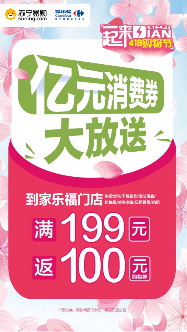4月9日,家樂福宣布面向全國消費者發(fā)放總額過億的家樂福消費券,旨在提振市民消費信心,促進消費回暖?!?18一起來Dian”購物節(jié)期間,凡在家樂福全國209家線下門店購物滿199元,即可獲贈總值100元的消費券(5張20元消費券),覆蓋眾多暢銷品類以及剛需民生商品(消費券可在指定期間使用)。