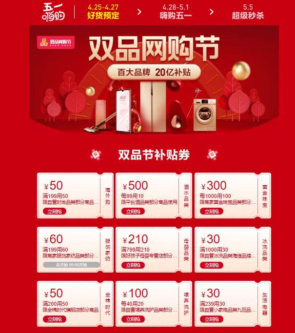 見圳客戶端·深圳新聞網(wǎng)2020年4月29日訊 貫穿整個(gè)五一假期的“雙品網(wǎng)購(gòu)節(jié)”已經(jīng)開啟,蘇寧、阿里等電商平臺(tái)紛紛上線促銷活動(dòng)。消費(fèi)補(bǔ)貼怎么領(lǐng),有哪些值得買的品質(zhì)好物,還有哪些活動(dòng)值得期待?消費(fèi)回暖,買買買的熱情迎來(lái)釋放。