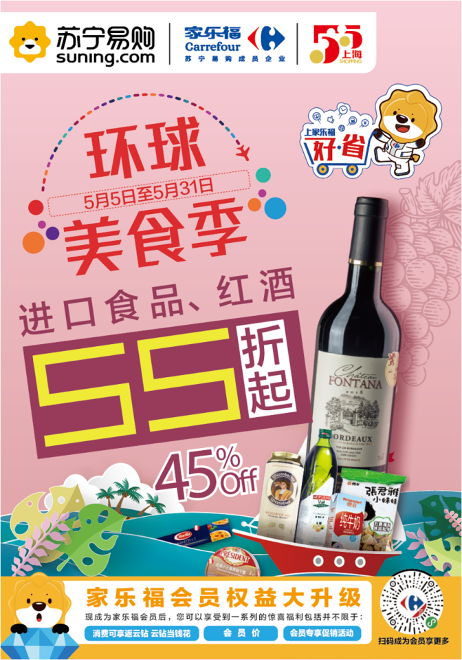 此外,家樂(lè)福方面還宣布將加大投入,全面支持上?!拔逦遒?gòu)物節(jié),全城打折季”。5月5日至31日,上海地區(qū)家樂(lè)福門店將開(kāi)啟“環(huán)球美食季”,精選來(lái)自法國(guó)、意大利、英國(guó)、西班牙、美國(guó)、加拿大、日本、韓國(guó)、馬來(lái)西亞等39個(gè)國(guó)家的350個(gè)品牌旗下共計(jì)3700多種進(jìn)口食品,與上海消費(fèi)者共襄盛舉。美食自然少不了美酒相伴,來(lái)自法國(guó)、意大利、西班牙、阿根廷、智利、澳洲等國(guó)家的70多個(gè)品牌旗下共計(jì)200多種進(jìn)口葡萄酒,也將悉數(shù)亮相全市家樂(lè)福門店。活動(dòng)期間,進(jìn)口食品低至5.5折起,進(jìn)口紅酒買一送一。進(jìn)博會(huì)“同款”法國(guó)奧格斯汀系列葡萄酒也將首次參與促銷,葡萄酒愛(ài)好者不容錯(cuò)過(guò)。