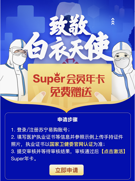 為表達(dá)對(duì)醫(yī)護(hù)工作者的敬意,蘇寧對(duì)全國醫(yī)護(hù)人員開放SUPER會(huì)員免費(fèi)申領(lǐng)活動(dòng)。
