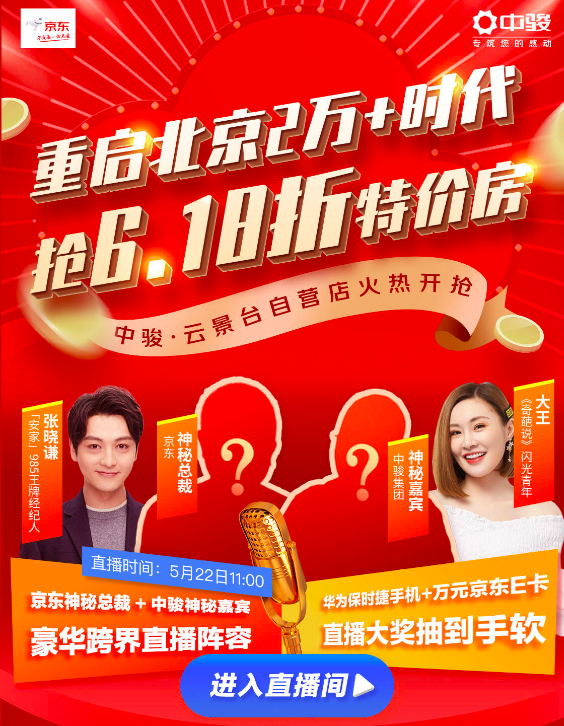 值得關注的是,中國內地男演員張曉謙、奇葩說選手大王、以及京東和中駿的兩位“神秘嘉賓”還將在5月22日上午11點帶來直播,在線預售全新房源,并將一套6.18折的特價房開展618抽獎活動,優(yōu)惠后僅需一百多萬元即可拿下一套北京新房。