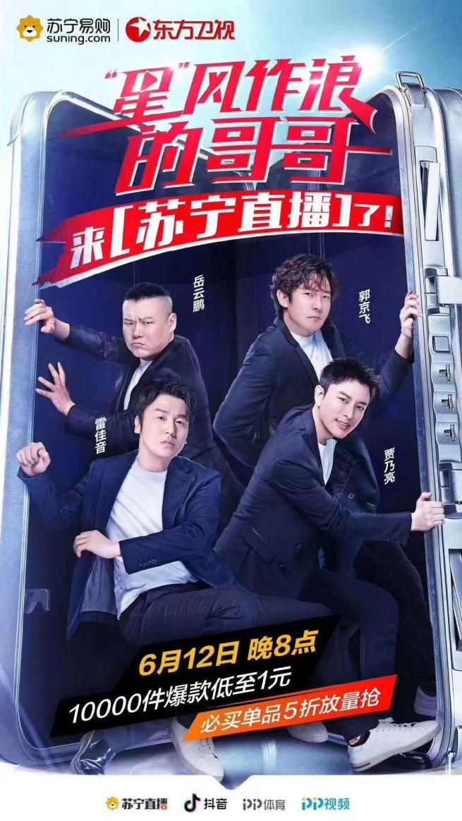 原來,蘇寧將在6月12日晚8點(diǎn)開啟以“星”風(fēng)作浪的哥哥為主題的直播活動(dòng),共計(jì)3個(gè)小時(shí)。正所謂娛樂購物兩不誤,極限挑戰(zhàn)將陣容搬到了直播間,4位明星搭檔主持,帶領(lǐng)用戶感受全方位的品質(zhì)化購物,煥新精彩生活。