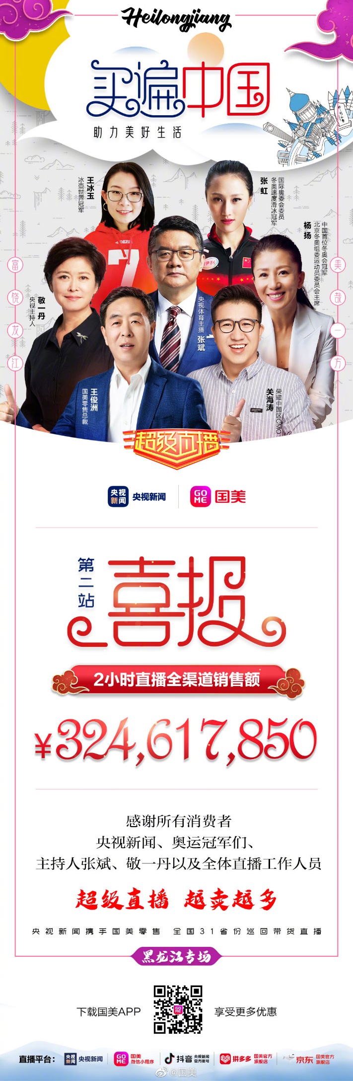 見圳客戶端·深圳新聞網2020年8月4日訊 群星閃耀,再創(chuàng)佳績!7月31日晚20點,“買遍中國·助力美好生活”全國31省份巡回帶貨直播黑龍江專場以3.25億的銷售額收官。出生于黑龍江的中央電視臺著名主持人敬一丹與黑龍江籍冬奧冠軍楊揚、張虹、王冰玉共同組成“龍江四美”,與央視體育頻道主持人張斌一起,展現了黑龍江歷史文化、鄉(xiāng)土風情,介紹了生態(tài)農業(yè)發(fā)展,也推薦了諸多美食與好物,并為北京冬奧會助力加油!
