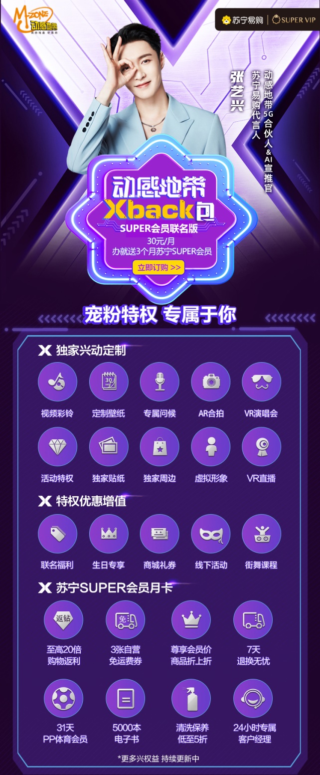 618期間張藝興成為蘇寧易購(gòu)代言人,7月21日中國(guó)移動(dòng)官宣張藝興為動(dòng)感地帶5G合伙人&AI宣推官。SUPER聯(lián)名版動(dòng)感地帶Xback包在818期間推出,讓蘇寧易購(gòu)和中國(guó)移動(dòng)的跨界營(yíng)銷合作浮出水面,外界也更好奇,818之后,蘇寧易購(gòu)和中國(guó)移動(dòng)是否還會(huì)有更大的動(dòng)作。