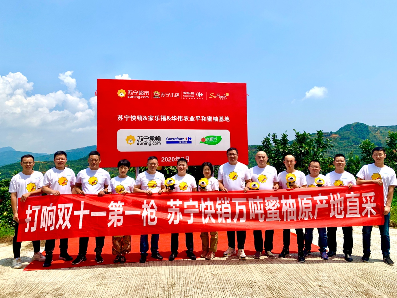8月26日,蘇寧家樂福中國區(qū)生鮮采購總監(jiān)孫樂超、水果組總監(jiān)孟碩、華南區(qū)采購總監(jiān)周益明,以及蘇寧易購水果組采銷總監(jiān)戴躍等一行來到位于福建省平和縣的華偉農(nóng)業(yè)蜜柚基地,與平和縣委書記郭德志等地方領導共同宣布蘇寧家樂福&華偉農(nóng)業(yè)蜜柚直采基地的正式啟動。