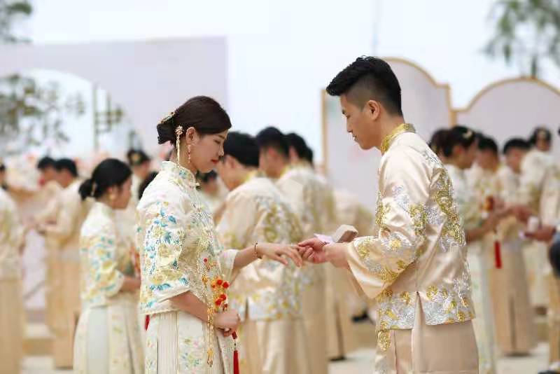 活動伊始,新人手舉紅傘穿過連理橋,在玫瑰園情話闖關(guān),在中西禮堂進行找新娘等默契互動,在自然展覽廳俯瞰香蜜公園全貌,與林立高樓與大片叢林相映成景的最美天際線合影,最后在氤氳浪漫的花香湖和花蜜湖畔,在親友與來賓的祝福下,40對新人身穿中式禮服,誦讀莊嚴的誓詞,許下今生不變的承諾。