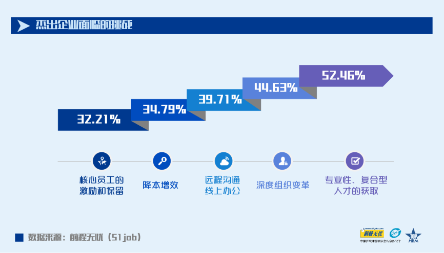 2020年杰出企業(yè)招聘員工總數較2019年增長了4.21%;55.48%的企業(yè)預計人均招聘成本呈增長趨勢,在此前提下,依然有56.04%的企業(yè)預計會在2021年擴大招聘來獲取人才優(yōu)勢。894家獲獎企業(yè)中,有469家將“為籌備未來招募新團隊,加大專業(yè)性人才和復合型人才的獲取“列為本年度企業(yè)人力資源管理所面臨的最大的挑戰(zhàn)。