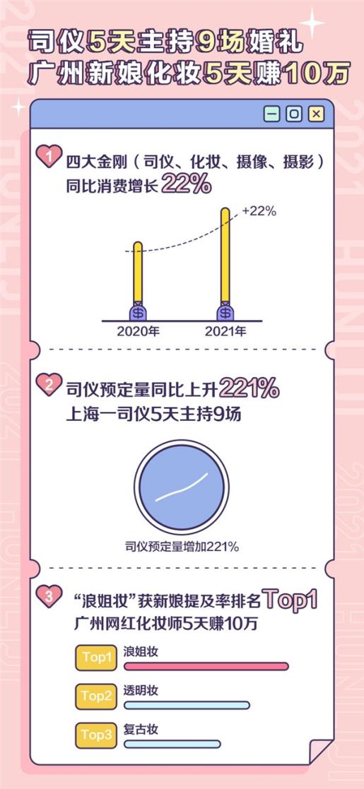 “快要忙瘋了,五一5天辦了150多場婚禮,第一天就有60場,去年這時候婚禮只有個位數(shù),今年我們員工都加班加點連夜趕工搭建場地。”婚禮紀(jì)商家Sunny喜鋪婚禮副總趙佳佳在接受采訪的時候表示,不僅商家忙,新人也非常忙,Z世代的新人都習(xí)慣于通過線上咨詢、直播下單等互聯(lián)網(wǎng)形式進(jìn)行婚禮消費,省去了線下奔波的時間。