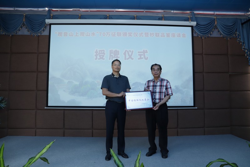 同時,經(jīng)中國楹聯(lián)學(xué)會研究決定,授予廣東觀音山國家森林公園“中國楹聯(lián)文化名山”榮譽稱號。中國楹聯(lián)學(xué)會顧問委員會副主任、中國楹聯(lián)學(xué)會原副會長、鄒繼海代表中國楹聯(lián)學(xué)會,為廣東觀音山國家森林公園授牌。