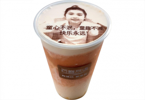 建議由孩子把自己或家人的照片加上一句話祝愿的話,作成圖片先保存到手機里。到店后,在云客茶語小程序上傳打印到奶茶上。整個制作過程約10分鐘。