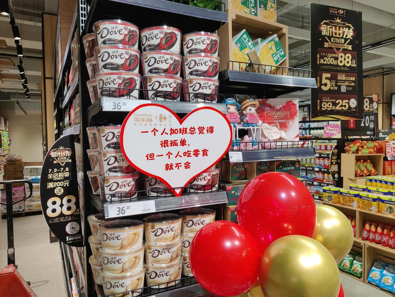 借著盛大開業(yè)的東風(fēng),家樂福社區(qū)品質(zhì)中心店推出了“優(yōu)品物語”的趣味逛店活動。該活動,在原本干巴巴的價格指示牌下面增加了諸如,“一個人吃飯很孤單,但一個人吃零食就不會”“隔壁的,你和卷心菜是什么關(guān)系?我是反內(nèi)卷菜系”“櫻桃:要我一口能讓你大紅”“藍莓:我還爆漿!能讓你大紫”等“Z世代”語言,吸引大家來發(fā)掘逛超市的趣味。不但年輕的小情侶可以在下班后默契地相視一笑,也吸引到小紅書的博主們競相探店打卡。既賦予了購物一點有趣和人性化,也給這屆年輕人動輒發(fā)圈、種草的社交型消費加點料。
