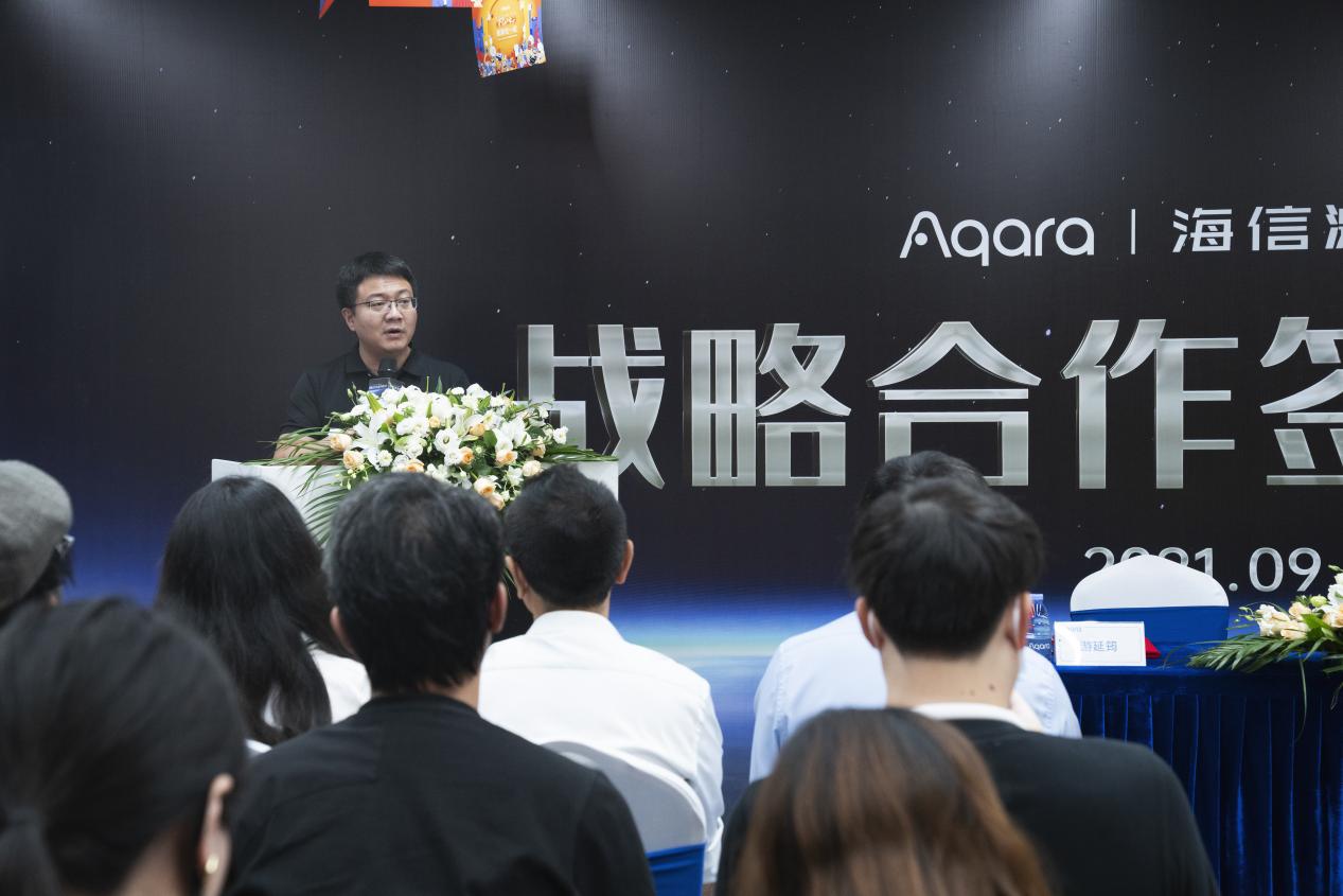 致辭環(huán)節(jié),海信集團(tuán)控股公司副總裁于芝濤也發(fā)來了線上祝福視頻,表達(dá)了對(duì)這次雙方合作,共同致力全屋智能美好體驗(yàn)再升級(jí)的美好祝愿。與此同時(shí),青島海信激光顯示股份有限公司的副總經(jīng)理王偉介紹了海信電視在戰(zhàn)略發(fā)展方向上的重塑新定位、新技術(shù)應(yīng)用、產(chǎn)品優(yōu)勢以及所取得的階段性成就等,并表示Aqara作為全球智慧生活方式的先行者和引領(lǐng)者,致力于打造「千人千面」的全屋智能生活方式,要做更懂用戶的“家”,這和海信電視“顯示無處不在,服務(wù)無處不在,連接無處不在”的發(fā)展理念不謀而合。除去智能化,雙方與生俱來的“綠色基因”更加夯實(shí)了這種合作契因,并始終堅(jiān)信,未來海信電視與Aqara將會(huì)不斷用綠色智能科技提升大家的家居生活品質(zhì),打造大屏?xí)r代的綠色客廳,引領(lǐng)中國IoT的發(fā)展。