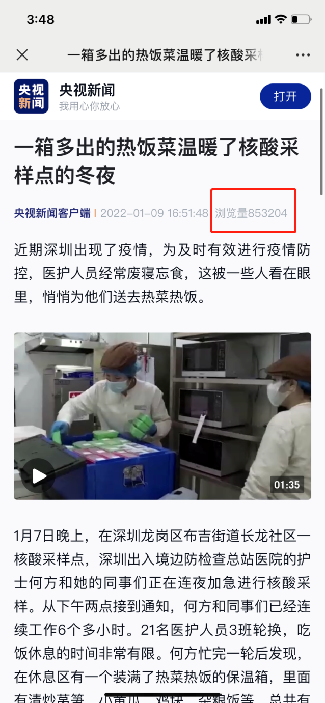 1月9日,一篇名為《一箱多出的熱飯菜溫暖了核酸采樣點(diǎn)的冬夜》的報(bào)道登上了央視新聞。在深圳全民抗疫期間,“維小飯”為核酸檢測(cè)醫(yī)護(hù)人員偷偷送上用保溫箱裝好的熱飯熱菜,獲網(wǎng)友紛紛點(diǎn)贊:你永遠(yuǎn)可以相信“深圳速度”,也永遠(yuǎn)可以相信“深圳創(chuàng)新”。央視新聞報(bào)道之后,熱度持續(xù)不減?!吧顝V電第一現(xiàn)場(chǎng)”“羊城晚報(bào)”“光明網(wǎng)”“中國(guó)青年網(wǎng)”等權(quán)威媒體也將此事件進(jìn)行了報(bào)道,引發(fā)眾網(wǎng)友熱議。